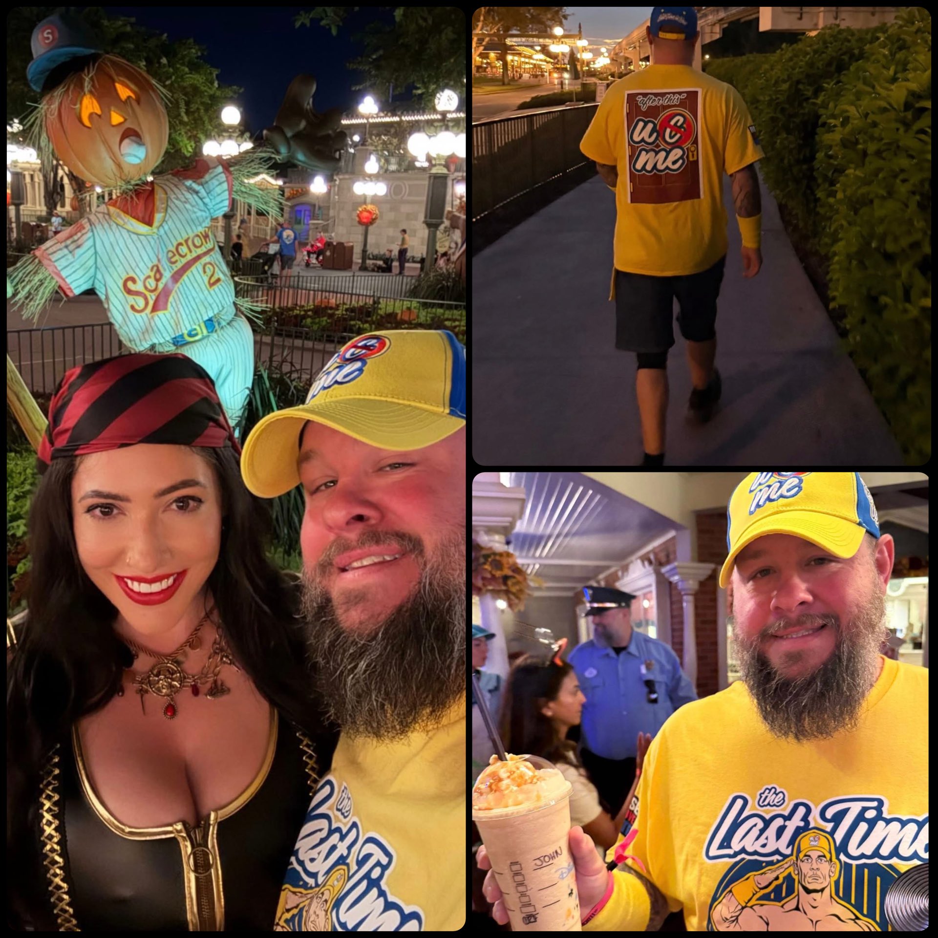 WWE star Kevin Owens, who is currently recovering from neck surgery, dressed up as his former rival John Cena—complete with jorts, t-shirt, wristbands, and a hat—for a family Halloween outing. Owens even had his Starbucks cup labeled “John.”