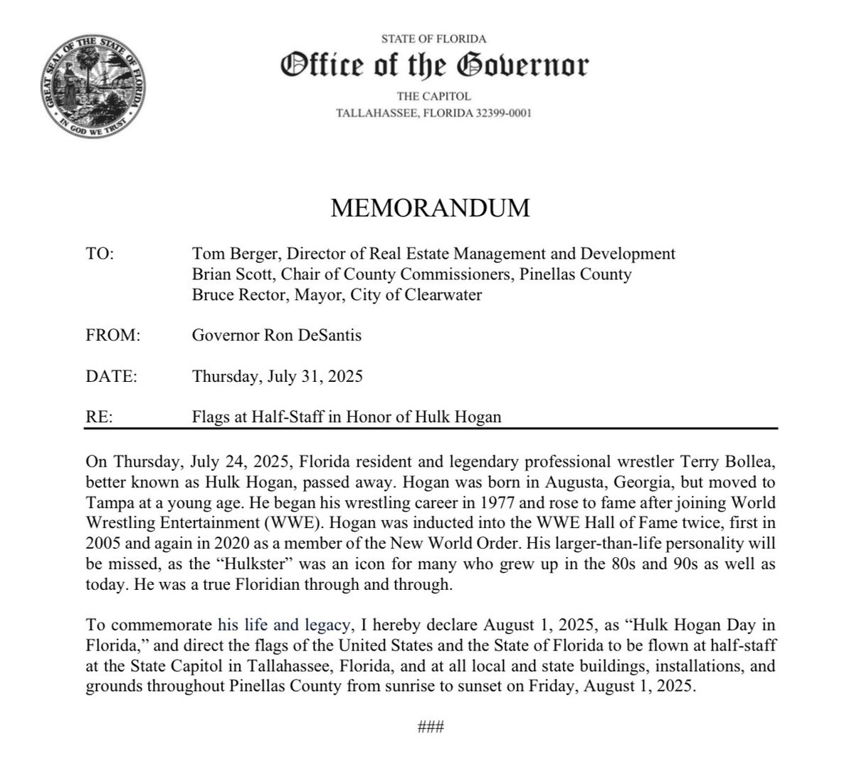 To commemorate his life and legacy, I hereby declare August 1, 2025, as “Hulk Hogan Day in Florida,” and direct the flags of the United States and the State of Florida to be flown at half-staff at the State Capitol in Tallahassee, Florida, and at all local and state buildings, installations, and grounds throughout Pinellas County from sunrise to sunset on Friday, August 1, 2025.