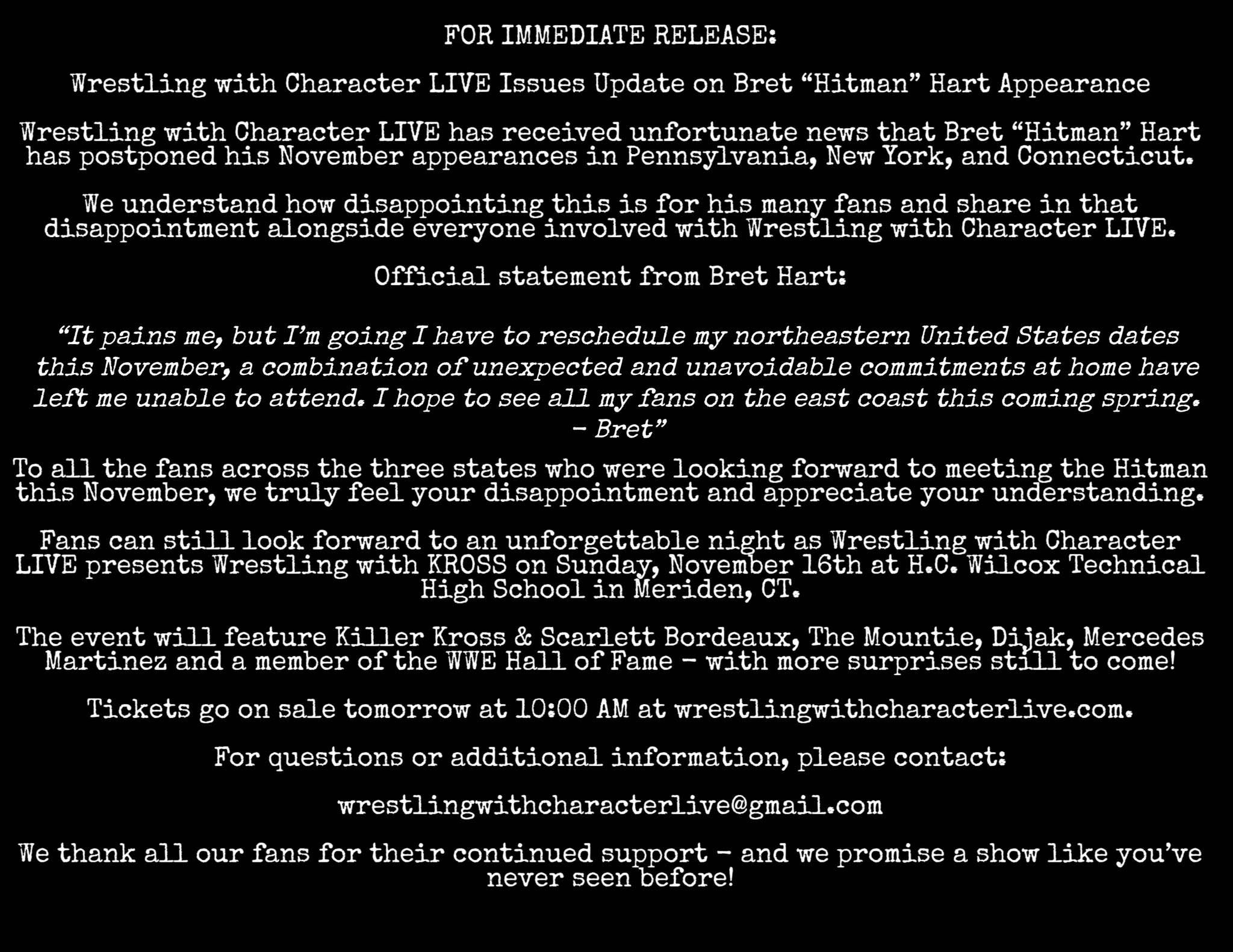 “Wrestling with Character LIVE has received unfortunate news that Bret ‘Hitman’ Hart has postponed his November appearances in Pennsylvania, New York, and Connecticut.