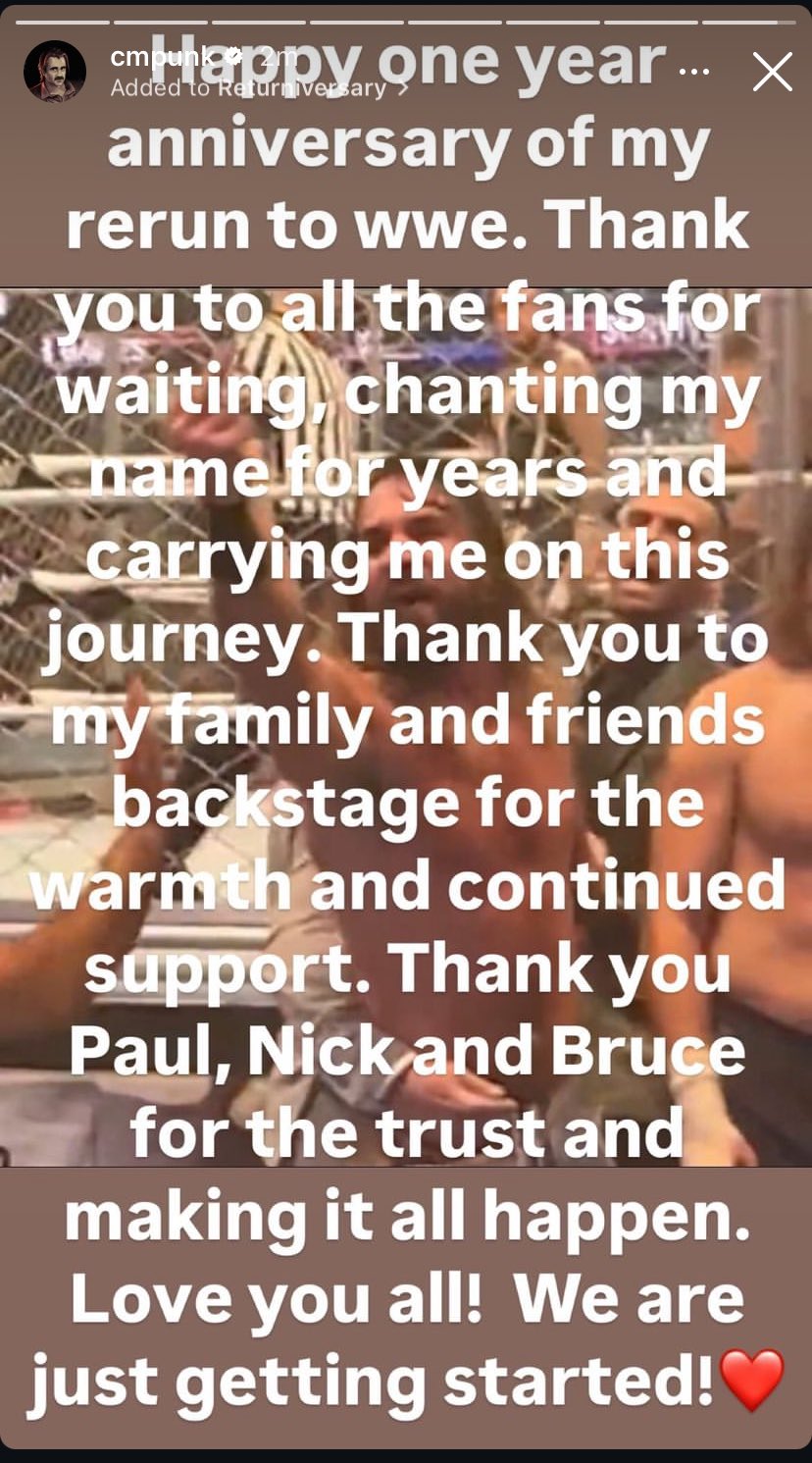 “Happy one year anniversary of my return to WWE. Thank you to all the fans for waiting, chanting my name for years, and carrying me on this journey. Thank you to my family and friends backstage for the warmth and continued support. Thank you Paul [Triple H], Nick [Khan], and Bruce [Prichard] for the trust and making it all happen. Love you all! We are just getting started!”