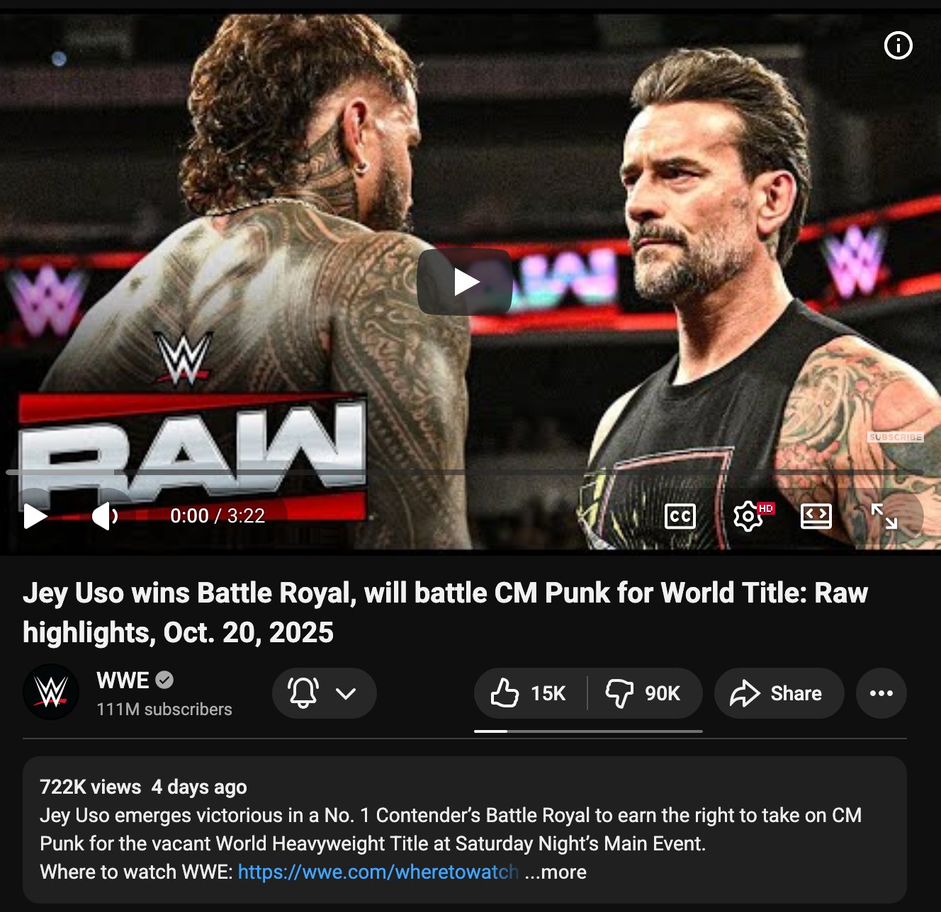 After winning a battle royal on the October 20th 2025 edition of WWE RAW, Jey Uso is scheduled to face CM Punk for the vacant world heavyweight title at Saturday Night’s Main Event. The fan reaction to Jey’s win was mixed as WWE’s YouTube video of the match has over 90,000 dislikes compared to 15,000 likes.
