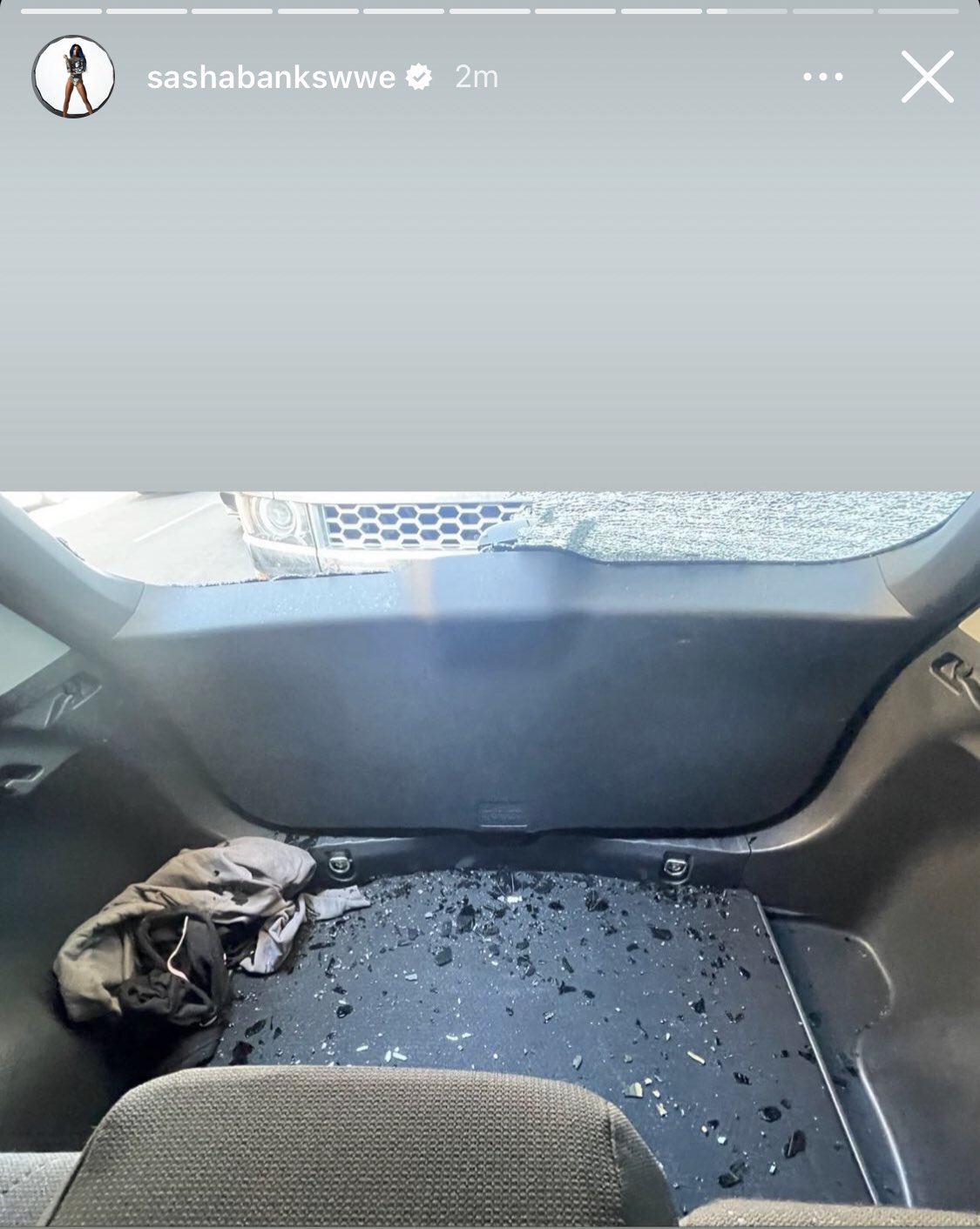 In a video shared to her Instagram story, Sasha Banks revealed that someone broke into her car and stole hair products. The incident happened in Oakland, CA and Sasha said that she had only been parked for five minutes. In another story, Sasha wrote “Have fun with the hair products [middle finger emoji].”