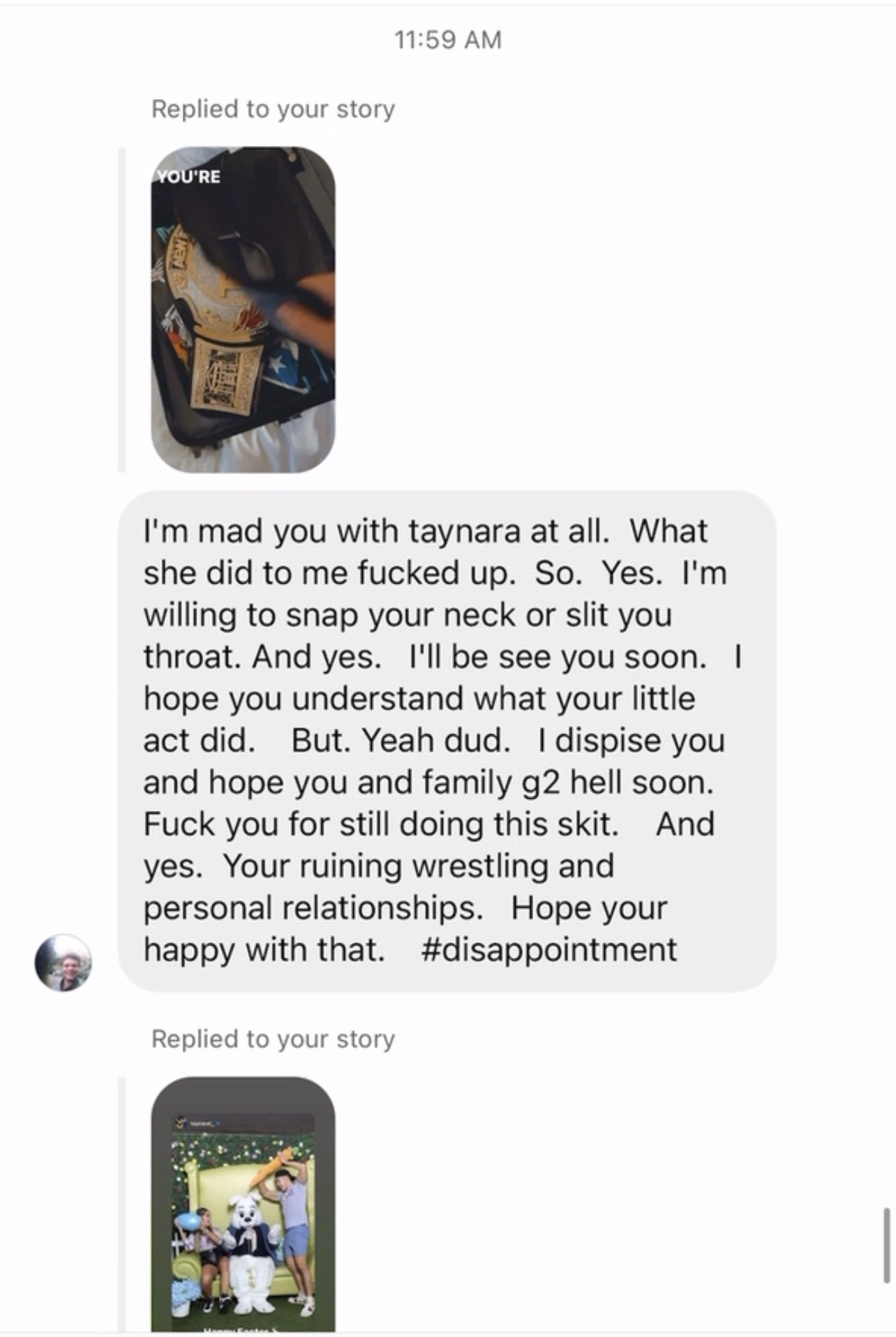 “I’m mad you with taynara at all. What she did to me f*cked up. So. Yes. I’m willing to snap your neck or slit you throat. And yes. I’ll be see you soon. I hope you understand what your little act did. But. Yeah dud. I dispise you and hope you and family g2 hell soon. F*ck you for still doing this skit. And yes. Your ruining wrestling and personal relationships. Hope your happy with that. #disappointment”